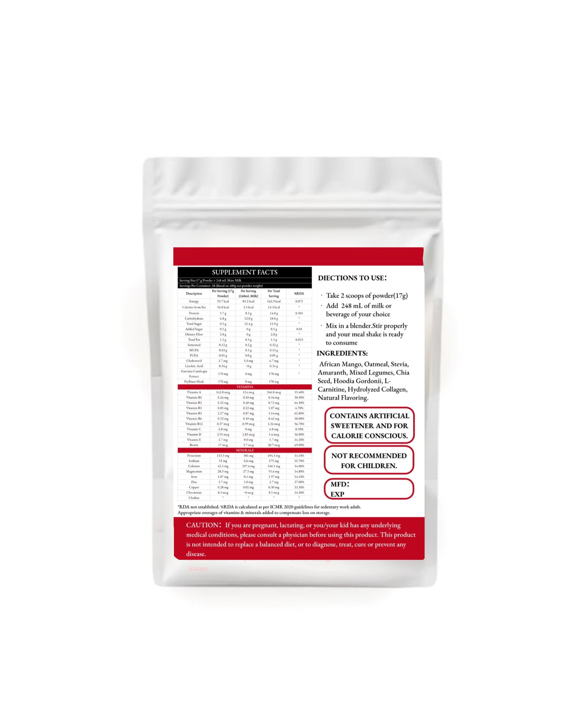 Mango Africano, Avena, Stevia, Amaranto, Mix legumbres, Chía, Hoodia Gordoni, L Carnitina, Colágeno, Caralluma, Garcinina.